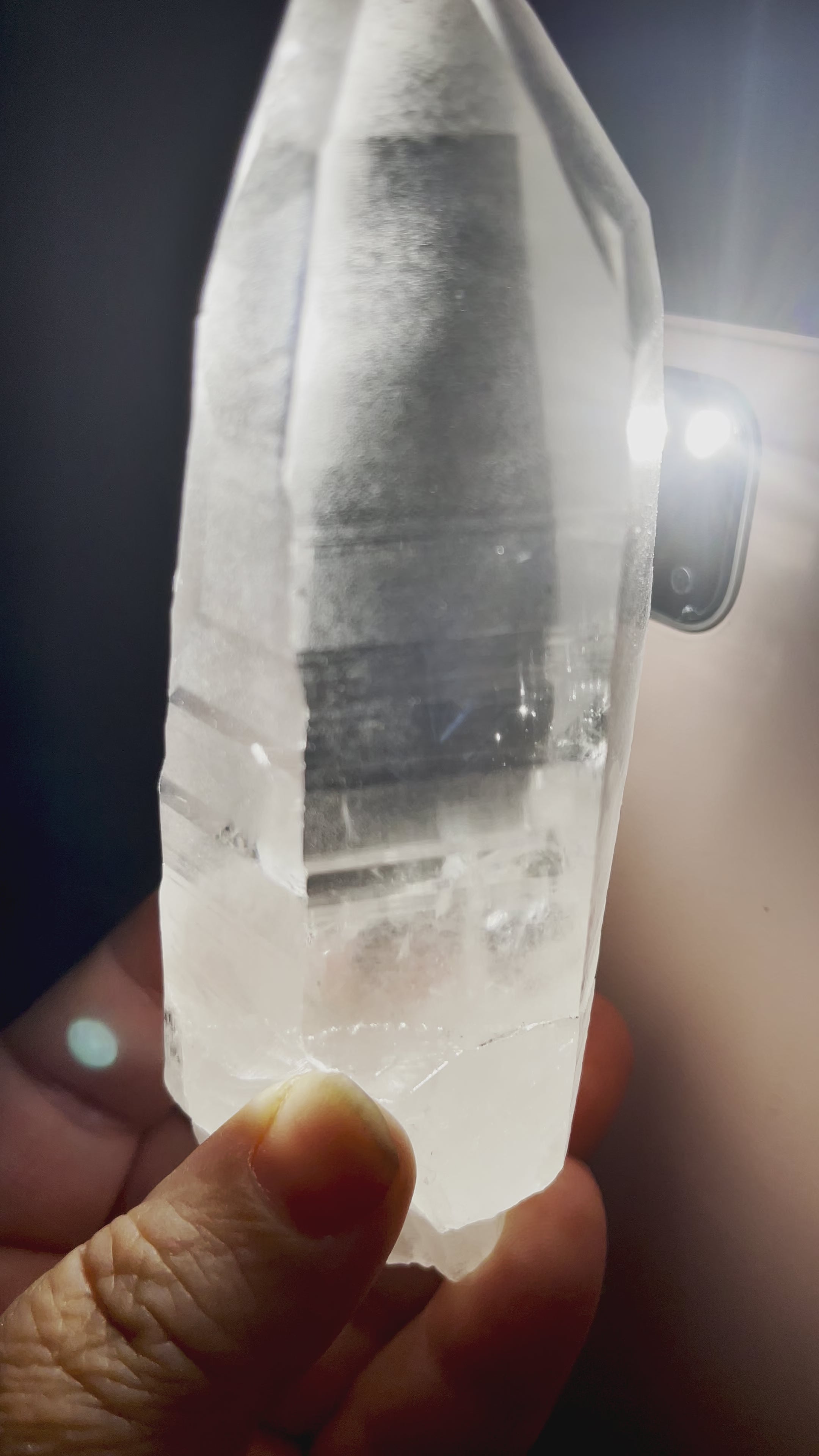 Energy Profile | Every crystal has been cleared and activated, waiting to work with you! These special crystals have a very rare inclusion that appear only when bright direct light is angled correctly into the lemurian quartz. Blue needle V like lines appear! These are a result of gas trapped in the quartz during growth. This is known as the Tyndall Effect. For more information on the energy profile of these Lemurians please read our blog post found here.