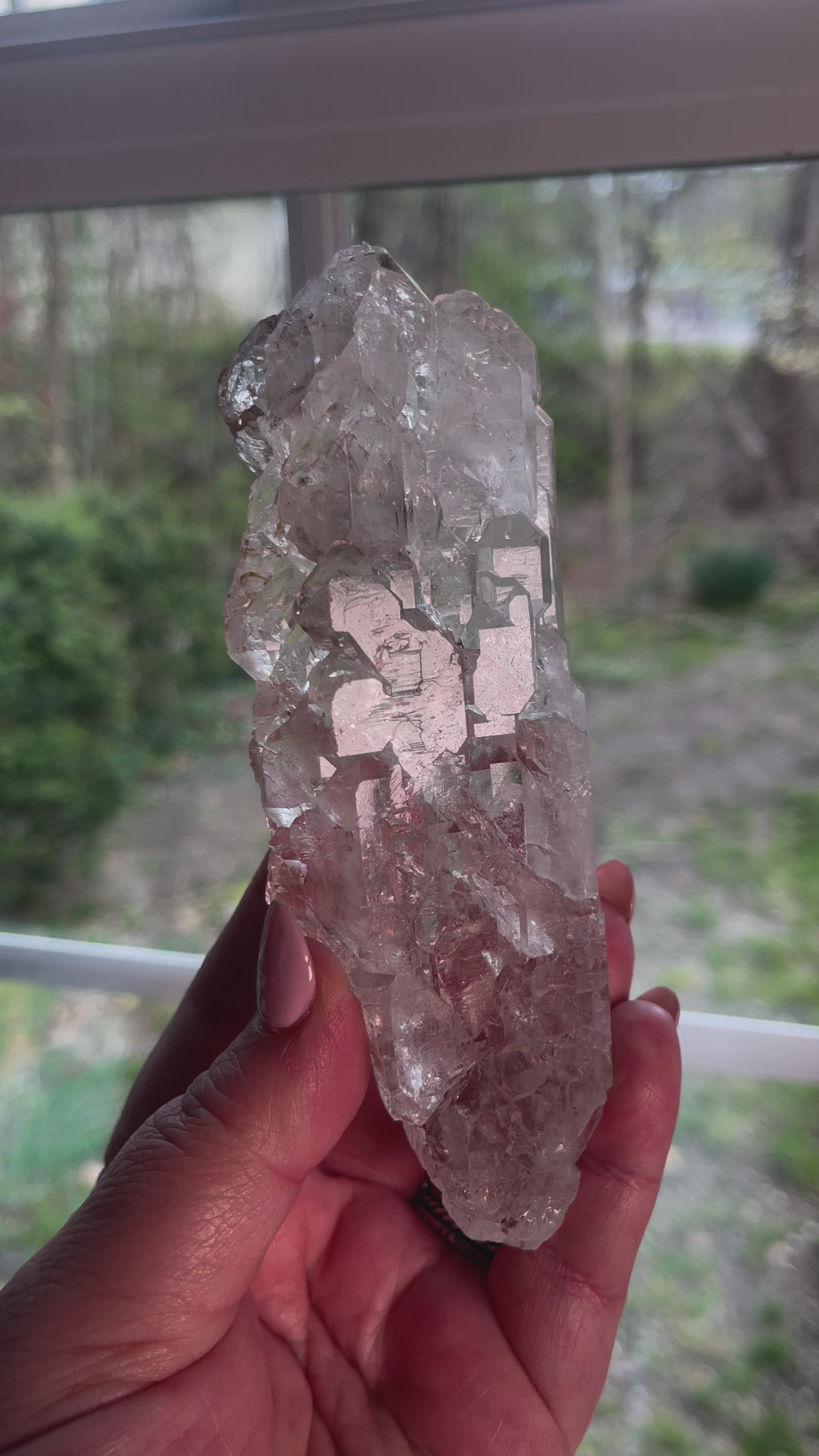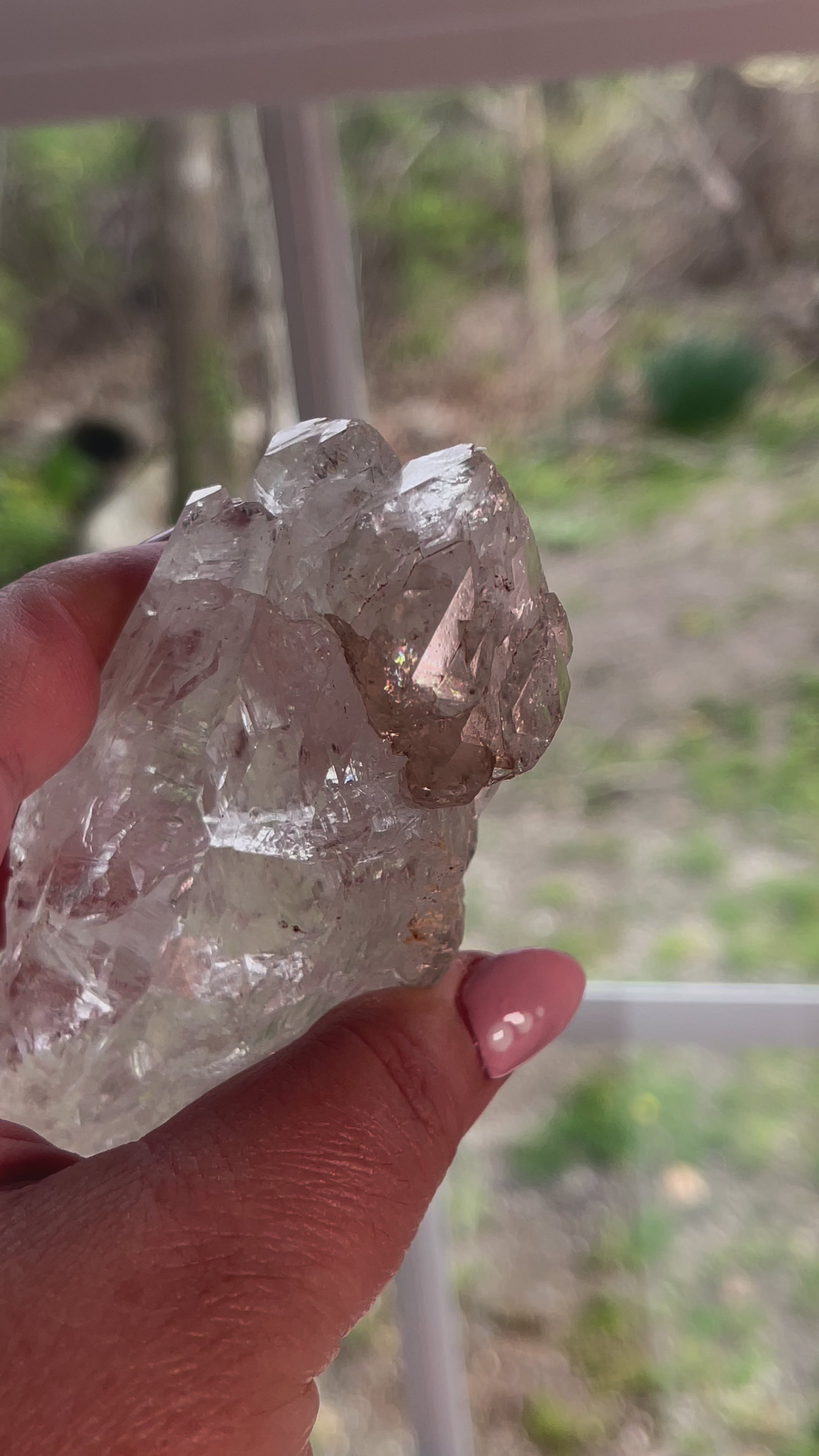 This is a rare lemurian, in that its 2nd growth has formed cathedral/elestial formations! Some would refer to the quality of the quartz as ice quartz because of the luster and clarity of the quartz.