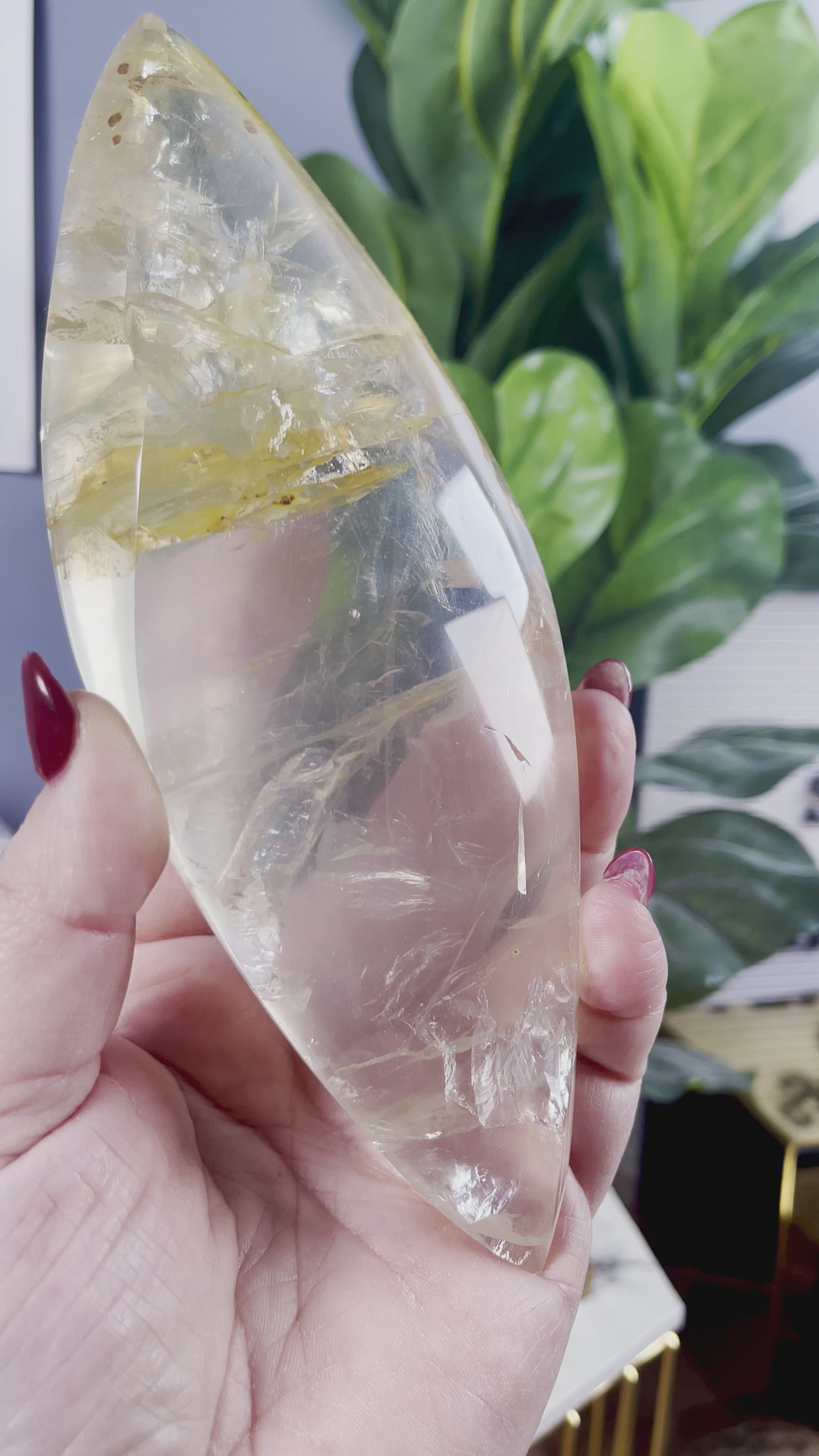 Girasol Golden Healer Quartz Flame with Gold Stand | Rainbows | F12